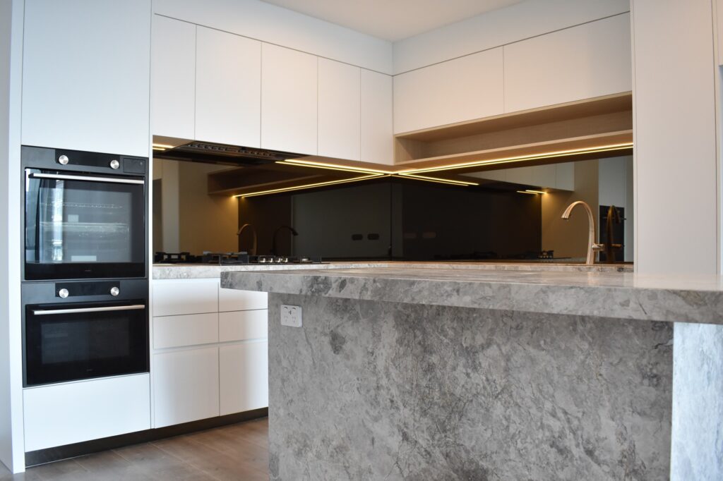 If your kitchen has strong stone patterns, heavy veining, or busy tile effects already, glitter can compete visually. In those cases, it is better to keep glitter confined to a narrow zone or choose a finer, more subtle sparkle.