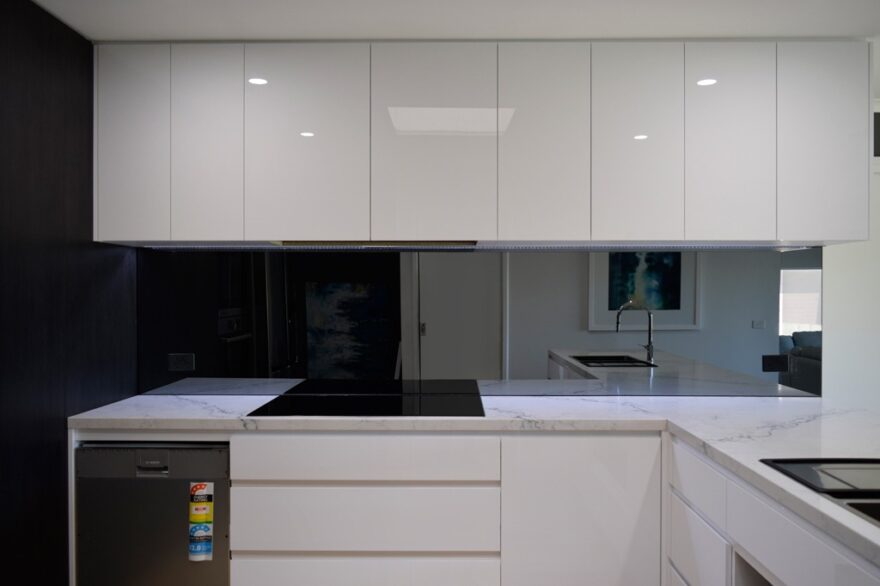 Because made to measure kitchen splashbacks are cut and toughened to exact sizes, accuracy matters. Measure after benchtops and cabinetry are installed, and confirm every cutout location for power points and switches. Once the glass is toughened, it cannot be modified.